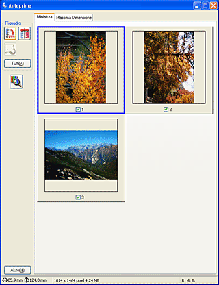 Il metodo di anteprima Miniatura consente di visualizzare in anteprima immagini multiple sotto forma di miniature. EPSON Scan individua automaticamente le immagini desiderate e applica la funzione Esposizione automatica a ciascuna immagine. È possibile modificare ciascuna miniatura ed effettuare ulteriori regolazioni sull'immagine. È inoltre possibile utilizzare delle cornici intermittenti per la scansione di parti specifiche di un'immagine. Per informazioni dettagliate sulle cornici intermittenti, vedere Uso delle cornici intermittenti.