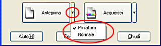 Facendo clic su Anteprima viene avviata la scansione preliminare e l'anteprima dell'immagine. A seconda della modalità impostata e delle impostazioni di Tipo documento, a destra del pulsante Anteprima viene visualizzata una piccola freccia che consente di selezionare un metodo di anteprima. Per cambiare il metodo di anteprima, fare clic sulla freccia e selezionare Miniatura o Normale.
