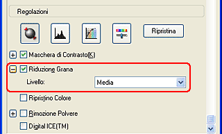 Quando si nota della grana nell'immagine acquisita, selezionare la casella di controllo Riduzione grana e quindi fare nuovamente clic su Acquisisci per ridurla. La selezione di un livello di riduzione grana maggiore rende la grana dell'immagine acquisita più morbida.