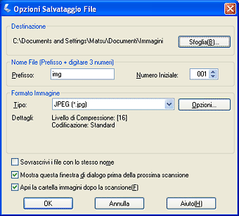 Se si desidera modificare il nome del file, digitare una stringa di caratteri alfanumerici nel Prefisso e selezionare il numero iniziale. Il nome del file viene generato con una combinazione di prefissi e numeri specificati qui.