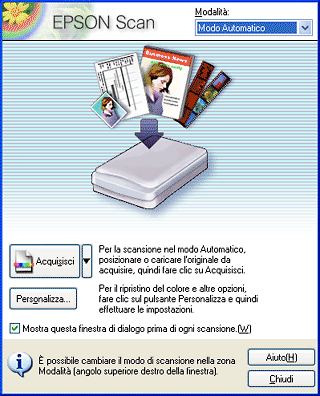EPSON Scan fornisce tre modi per l'esecuzione delle impostazioni di scansione: Automatico, Principiante o Professionale. In questa sezione viene descritto come acquisire un'immagine nel modo Automatico. Il modo Automatico consente di acquisire immagini utilizzando impostazioni con regolazione automatica. Per informazioni dettagliate, vedere Scelta del modo di scansione appropriato.