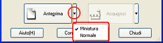Facendo clic su Anteprima nel modo Principiante o nel modo Professionale, viene avviata la scansione preliminare e l'anteprima dell'immagine. A seconda della modalità impostata e delle impostazioni di Tipo documento, a destra del pulsante Anteprima viene visualizzata una piccola freccia che consente di selezionare un metodo di anteprima. Per cambiare il metodo di anteprima, fare clic sulla freccia e selezionare Miniatura o Normale.