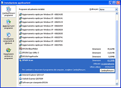 Selezionare EPSON Scan dall'elenco, quindi fare clic su Cambia/Rimuovi (Windows XP o 2000) o su Aggiungi/Rimuovi (Windows Me o 98 SE).