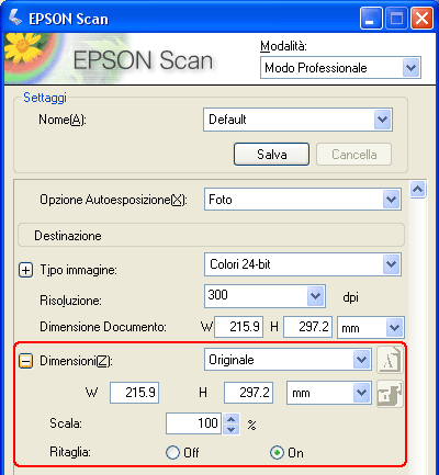 La modalità selezionata rimane valida al successivo avvio di Epson Scan.
