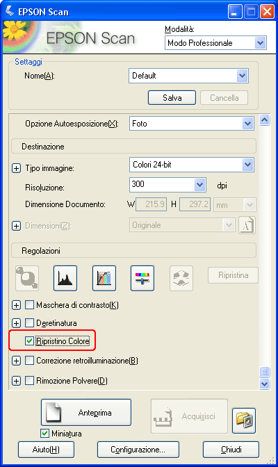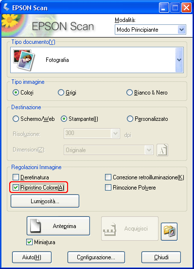 Per ripristinare i colori utilizzando Epson Scan, effettuare i passaggi che seguono.