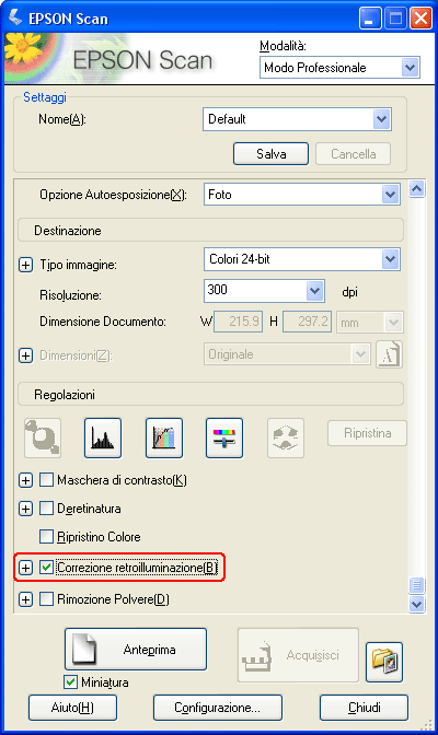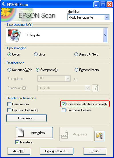 Per correggere le foto retroilluminate utilizzando Epson Scan, effettuare i passaggi che seguono.