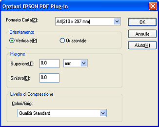 Se è necessario modificare una delle impostazioni PDF correnti, fare clic sul pulsante Opzioni. Verrà visualizzata la finestra delle Opzioni EPSON PDF Plug-in.