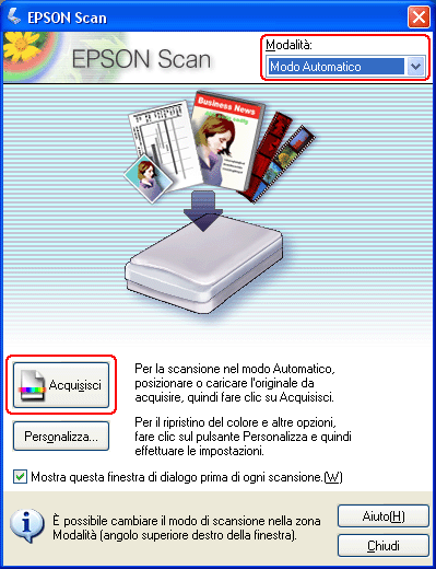 Se la casella di riepilogo Modalità nell'angolo superiore destro della finestra è impostata su Modo Automatico, fare clic sul pulsante Acquisisci. Epson Scan acquisisce automaticamente l'immagine salvandola come file JPEG nella cartella Immagini. Per istruzioni sulla selezione delle impostazioni opzionali, vedere Uso del Modo Automatico. ![]()