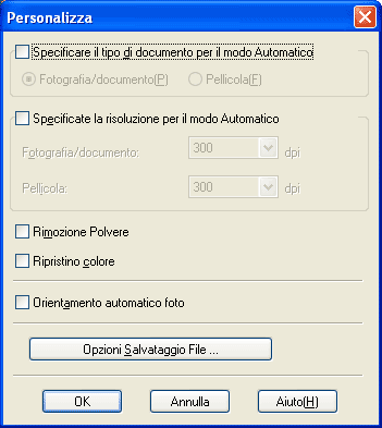 Il Modo Automatico è consigliato quando è necessario acquisire documenti o foto con le dimensioni originali (100%) e non è necessario creare un'anteprima delle immagini prima della scansione. È possibile ripristinare i colori sbiaditi o rimuovere i segni della polvere facendo clic sul pulsante Personalizza. Per istruzioni sulla scansione con questa modalità, vedere Uso del Modo Automatico.