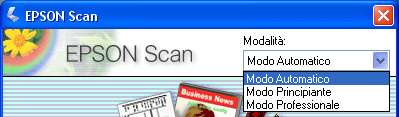 Modifica della modalità di scansionePer modificare la modalità di scansione, fare clic sulla freccia nella casella di riepilogo Modalità nell'angolo superiore destro della finestra di Epson Scan. Selezionare quindi la modalità che si desidera utilizzare dall'elenco visualizzato.