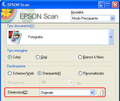 Se le immagini verranno ingrandite in Epson Scan in modo da poterle utilizzare a dimensioni maggiori, è possibile mantenere le impostazioni di Risoluzione selezionate da Epson Scan in base alle impostazioni della Destinazione (solo Modo Principiante).