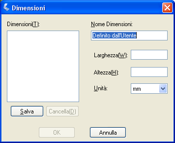 ![]() Digitare un nome per le dimensioni personalizzate, immettere le dimensioni, fare clic sul pulsante Salva, quindi fare clic su OK. Le nuove dimensioni verranno visualizzate nell'elenco Dimensioni.