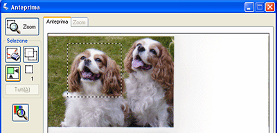 Per ingrandire un'immagine, fare clic all'interno dell'area di scansione e fare clic sul pulsante Zoom. Epson Scan esegue una nuova scansione preliminare e visualizza un'anteprima di dimensioni maggiori nella scheda Zoom (le altre immagini rimangono visualizzate come anteprime di dimensioni originali sulla scheda Anteprima).