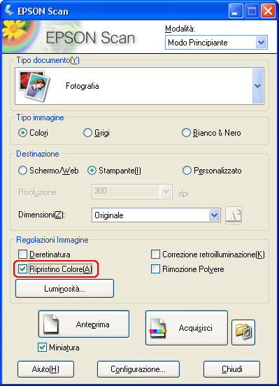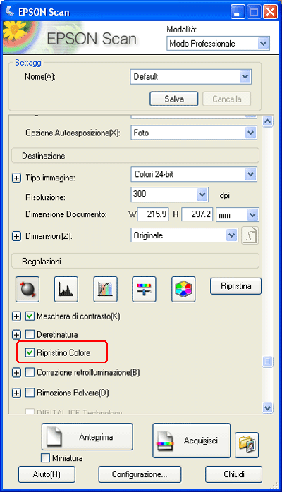 Per ripristinare i colori utilizzando Epson Scan, effettuare i passaggi che seguono.