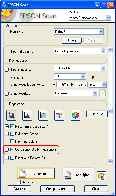 Per correggere le foto retroilluminate utilizzando Epson Scan, effettuare i passaggi che seguono.
