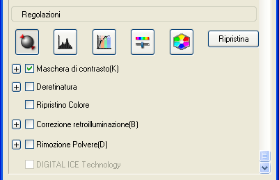 Consente di rimuovere automaticamente i segni della polvere dall'originale. Gli effetti della Rimozione Polvere non vengono visualizzati nell'anteprima ma solo nell'immagine acquisita. Il livello dell'effetto di Rimozione Polvere è regolabile.