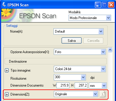 Per ulteriori informazioni sull'uso degli strumenti di Dimensioni fare clic su Aiuto nella finestra di Epson Scan.
