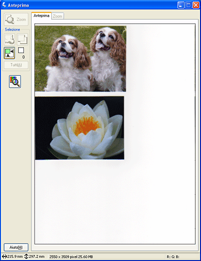 Per ingrandire un'immagine, fare clic all'interno dell'area di scansione e fare clic sul pulsante Zoom. Epson Scan esegue una nuova scansione preliminare e visualizza un'anteprima di dimensioni maggiori nella scheda Zoom (le altre immagini rimangono visualizzate come anteprime di dimensioni originali sulla scheda Anteprima).