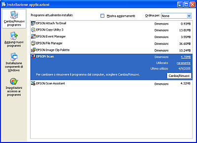 Fare clic su EPSON Scan nell’elenco dei programmi correntemente installati e fare clic su Cambia/Rimuovi (Windows XP o 2000) o Aggiungi/Rimuovi (Windows Me o 98 SE).