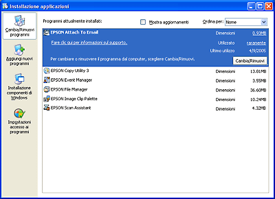 Fare clic su EPSON Attach to Email nell’elenco dei programmi correntemente installati e fare clic su Cambia/Rimuovi (Windows XP o 2000) o Aggiungi/Rimuovi (Windows Me o 98 SE).