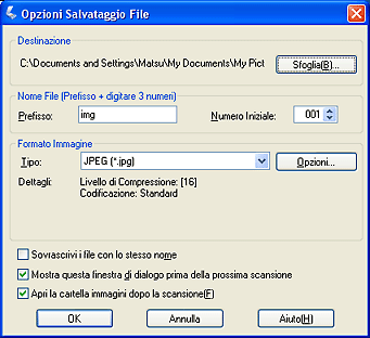 Se la scansione è stata avviata eseguendo EPSON Scan come un programma autonomo, viene visualizzata la finestra Opzioni Salvataggio File. Questa finestra consente di selezionare il nome e la destinazione dei file di scansione salvati. Per dettagli, vedere Selezione delle opzioni di salvataggio del file.
