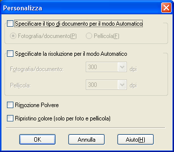 Se si desidera selezionare una risoluzione personalizzata, ripristinare colori sbiaditi o rimuovere i segni della polvere dall'immagine della pellicola o della diapositiva, fare clic sul pulsante Personalizza. Viene visualizzata la finestra Personalizza: