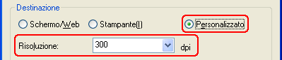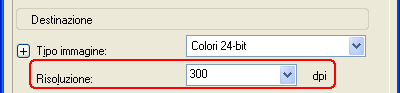 Le immagini verranno acquisite a dimensioni originali ma ingrandite in seguito mediante un programma di fotoritocco. Se si intende ingrandire le immagini mediante un programma di fotoritocco in un secondo momento, è necessario aumentare l'impostazione di Risoluzione per mantenere un'elevata qualità dell'immagine dopo l'ingrandimento. Aumentare la risoluzione in modo proporzionale all'aumento delle dimensioni dell'immagine. Ad esempio, se la risoluzione è 300 dpi (punti per pollice) ma l'immagine verrà ingrandita del 200% in un programma di fotoritocco, portare l'impostazione di Risoluzione in EPSON Scan a 600 dpi.