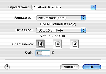 Consente di definire le impostazioni appropriate di Impostazioni, Formato per, Dimensioni, Orientamento e Scala da utilizzare per la stampa.