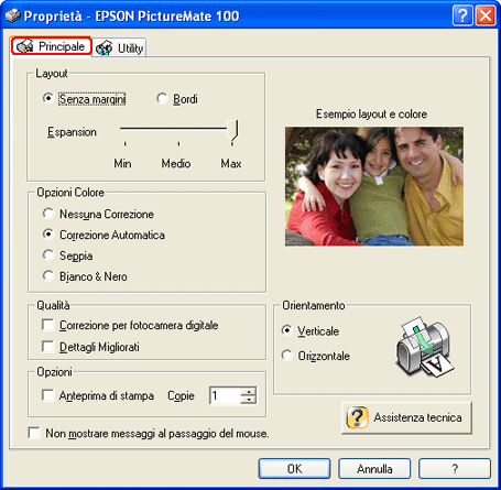 Nel menu Principale possibile effettuare le impostazioni di Layout, Qualit, Opzioni, Opzione colore e Orientamento. Fare riferimento alla sezione appropriata riportata di seguito.