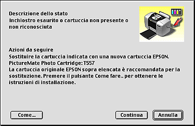 Quando l'inchiostro è scarso o esaurito, appare il pulsante Come.... Fare clic su Come... ed EPSON StatusMonitor guiderà l'utente nella procedura di sostituzione della cartuccia fotografica.
