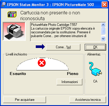 Quando l'inchiostro è scarso o esaurito, sotto la casella di testo viene visualizzato il pulsante Come.... Fare clic su Come... ed EPSON Status Monitor 3 guiderà l'utente nella procedura di sostituzione della cartuccia.