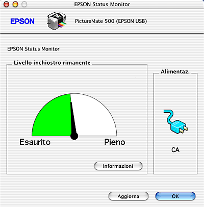È possibile utilizzare questa utility per controllare il livello di inchiostro e lo stato dell'alimentazione prima della stampa. EPSON StatusMonitor visualizza la quantità di inchiostro rimanente al momento dell'apertura. Per aggiornare le informazioni sul livello di inchiostro, fare clic su Aggiorna. Quando si utilizza la stampante con una batteria opzionale, è possibile controllare la quantità di carica rimanente nella batteria.
