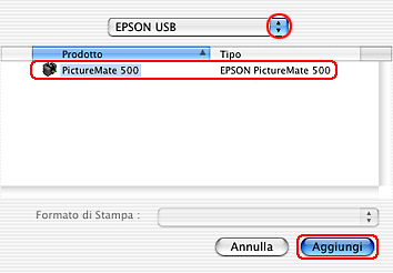 Fare clic sul pulsante Aggiungi in Centro Stampa o Utility di configurazione stampante e selezionare la porta appropriata. Per la selezione della porta, vedere la tabella che segue.