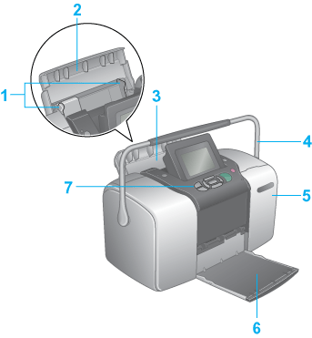 1. Guide laterali: Aiutano a caricare la carta in modo corretto. Regolare la guida laterale sinistra in base alla larghezza della carta.