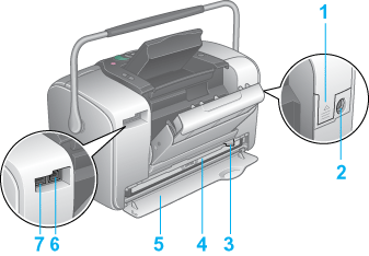 7. Porta EXT/IF (USB): Utilizzata per collegare alla stampante l'adattatore di stampa fotografica Bluetooth o dispositivi di archiviazione esterni e fotocamere digitali dotate di funzionalità USB DIRECT-PRINT.