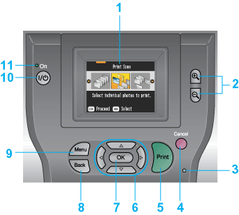 4. Tasto Cancel: Annulla le operazioni di stampa o le impostazioni sul display LCD.