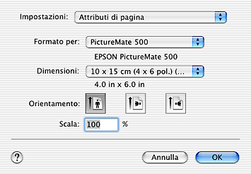 Consente di definire le impostazioni appropriate di Impostazioni, Formato per, Dimensioni, Orientamento e Scala da utilizzare per la stampa.