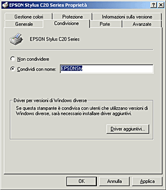 Se si desidera che Windows 2000 trasferisca automaticamente i driver della stampante sui computer non dotati di Windows 2000, fare clic su Driver aggiuntivi e selezionare l'ambiente e il sistema operativo per gli altri computer. Fare clic su OK per installare i driver alternativi.
