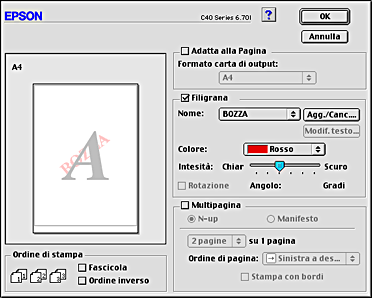 Selezionare la filigrana che si desidera stampare dall'elenco Nome, quindi specificarne posizione, dimensione, colore e intensità. È possibile modificare la posizione e la dimensione della filigrana trascinandola con il mouse nella finestra di anteprima a sinistra.