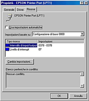 ![]() | Selezionare un'impostazione di configurazione di base dall'elenco "Impostazioni basate su" che utilizza le stesse impostazioni di Intervallo di input/output annotate nel punto 4 e accertarsi che i valori del canale di Accesso diretto alla memoria (DMA) e del Livello di interrupt siano allocati e visualizzati. Verificare inoltre che nell'Elenco periferiche in conflitto sia visualizzato Nessun conflitto. |