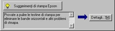 Nella casella di testo della parte inferiore della finestra della Barra di avanzamento vengono visualizzati suggerimenti per sfruttare al meglio il software della stampante EPSON. Ogni 30 secondi viene visualizzato un nuovo suggerimento. Per ulteriori dettagli sul suggerimento visualizzato in quel momento, fare clic sul pulsante Dettagli.