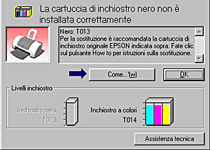Quando l'inchiostro è scarso o esaurito, sotto la casella di testo apparirà il pulsante Come.... Fare clic su Come... ed EPSON Status Monitor 3 guiderà l'utente nella procedura di sostituzione della cartuccia.