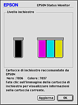 L'immagine grafica visualizza la quantità di inchiostro rimanente al momento dell'apertura di EPSON StatusMonitor. Per aggiornare l'informazione sul livello di -inchiostro, fare clic sul pulsante Aggiorna.