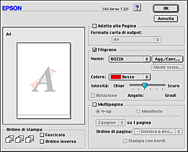 Per Macintosh: selezionare la casella Filigrana della finestra di dialogo Layout, quindi selezionare la filigrana voluta nell'elenco Nome filigrana.