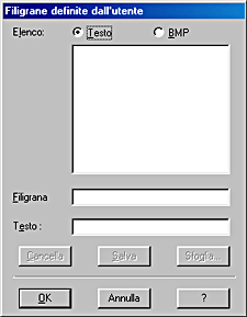È possibile inoltre aggiungere, all'elenco Filigrana, filigrane definite dall'utente, di tipo testo o immagine.