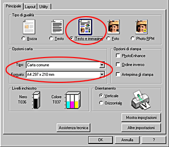 Fare clic sulla scheda Principale, quindi selezionare Carta comune e A4 come impostazioni di Opzioni carta e Testo e immagine come impostazione di Tipo di qualità.