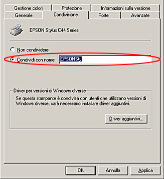 Se si desidera che Windows XP o 2000 trasferisca automaticamente i driver della stampante su computer dotati di diverse versioni di Windows, fare clic su Driver aggiuntivi e selezionare l'ambiente e i sistemi operativi per gli altri computer. Fare clic su OK, quindi inserire il CD del software della stampante nell'unità CD-ROM. Selezionare WIN9X per Windows Me, 98 o 95. Fare clic su OK per installare i driver aggiuntivi.