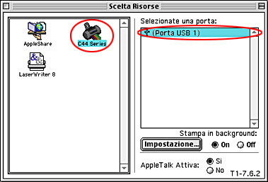 Scegliere Scelta risorse dal menu Apple, fare clic sull'icona relativa alla stampante appropriata, quindi selezionare la porta della stampante da utilizzare dall'elenco Seleziona una porta stampante.