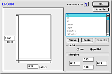 Selezionare il formato della carta da usare. Se si desidera definire un formato carta personalizzato, vedere Definizione di un formato carta personalizzato. |