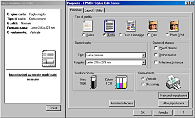 È possibile eseguire le impostazioni di Tipo di qualità, Opzioni carta, Opzioni di stampa, Orientamento, Altre impostazioni e controllare i livelli di inchiostro. Fare riferimento alla sezione appropriata riportata di seguito.